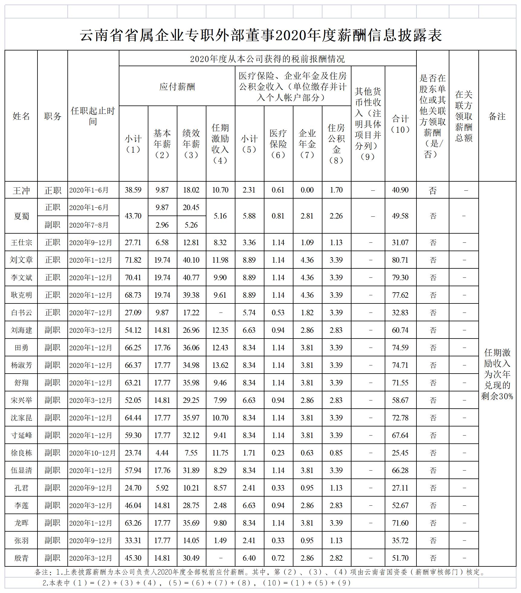云南省省属企业专职外部董事2020年度薪酬信息披露表