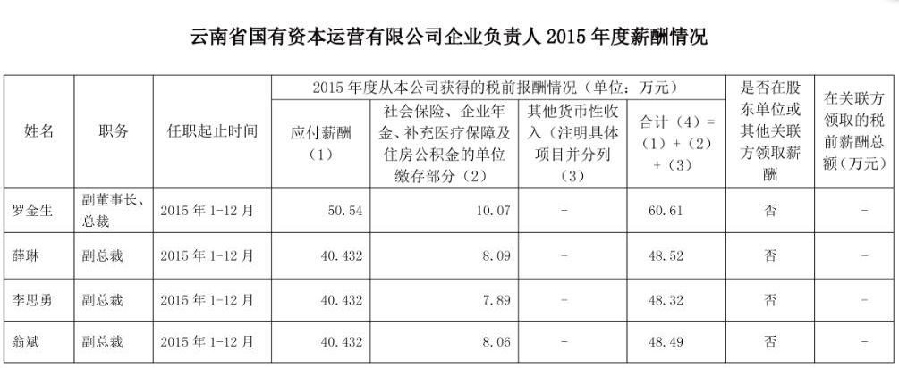根据《云南省关于深化省属企业负责人薪酬制度改革的意见》(云发[2015]19号)和省国企薪改办《关于做好2015年度省属企业负责人薪酬信息披露工作的通知》(云国企薪改办[2017]1号)的要求,经省国资委对公司管理者2015年度经营业绩考核及年薪测算,现对公司管理者2015年度薪酬情况披露如下: