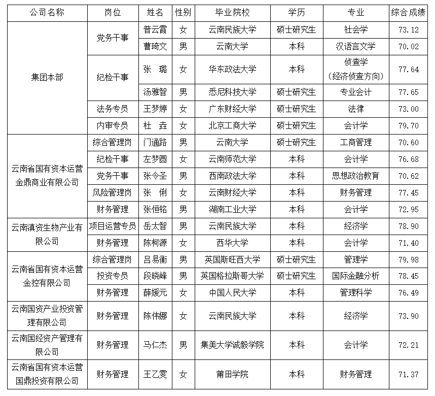 根据《sa36沙龙国际云南资本2020年招聘高校毕业生公告》的相关规定,经审核筛选、初试、复试、体检等程序,拟录用19人,现将拟录用人员名单公示如下: