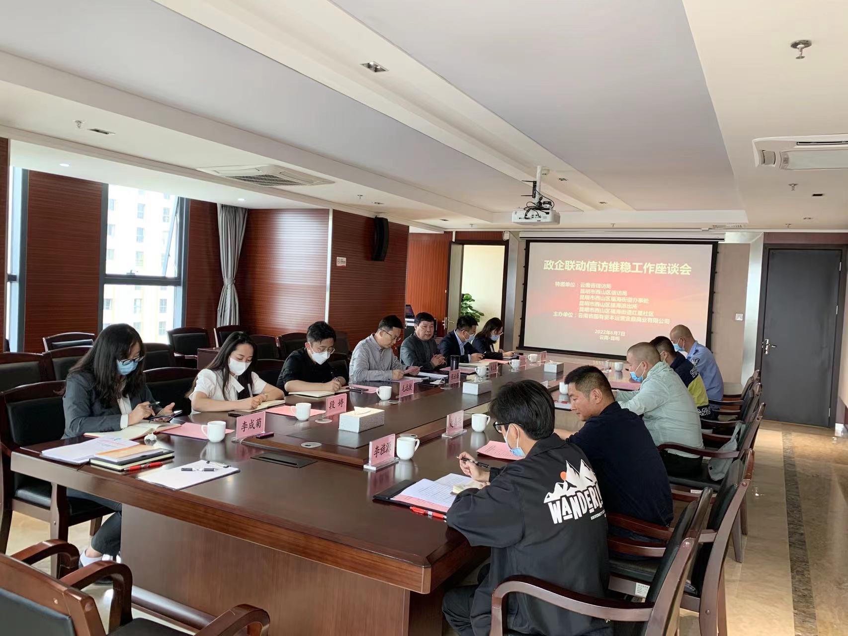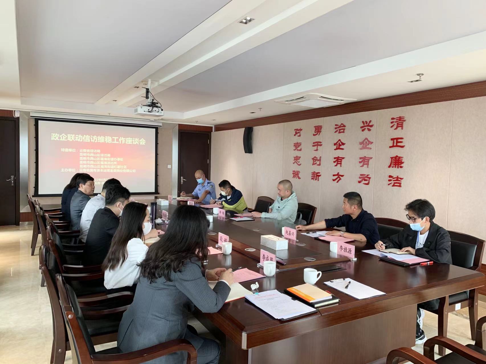 2022年6月7日下午,为进一步增强政企联动,深化政企联动信访维稳机制对企业信访维稳工作的指导作用,确保不发生群体性上访事件,以优异成绩迎接党的二十大胜利召开。金鼎商业在云南资本18楼2号会议室组织召开2022年度政企联动信访维稳工作座谈会。会议特邀云南省信访局、西山区信访局、福海街道办事处、福海派出所、红星社区等单位负责同志及相关领导到会指导,金鼎商业领导班子及各职能部门负责人参加。