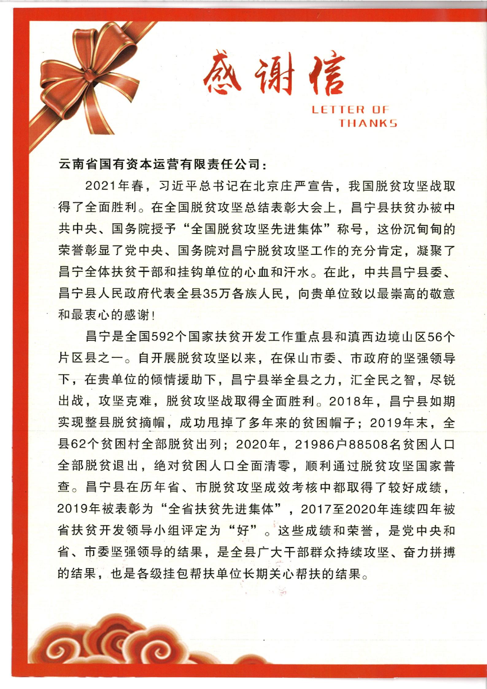 “回望昌宁筚路蓝缕、克难奋进的脱贫攻坚历程,一路有贵单位的倾心帮扶、鼎力相助!多年来,贵单位深入贯彻习近平总书记关于扶贫工作的重要论述,以高度的政治责任感和使命感,发扬伟大的脱贫攻坚精神,主动扛起挂钩帮…
