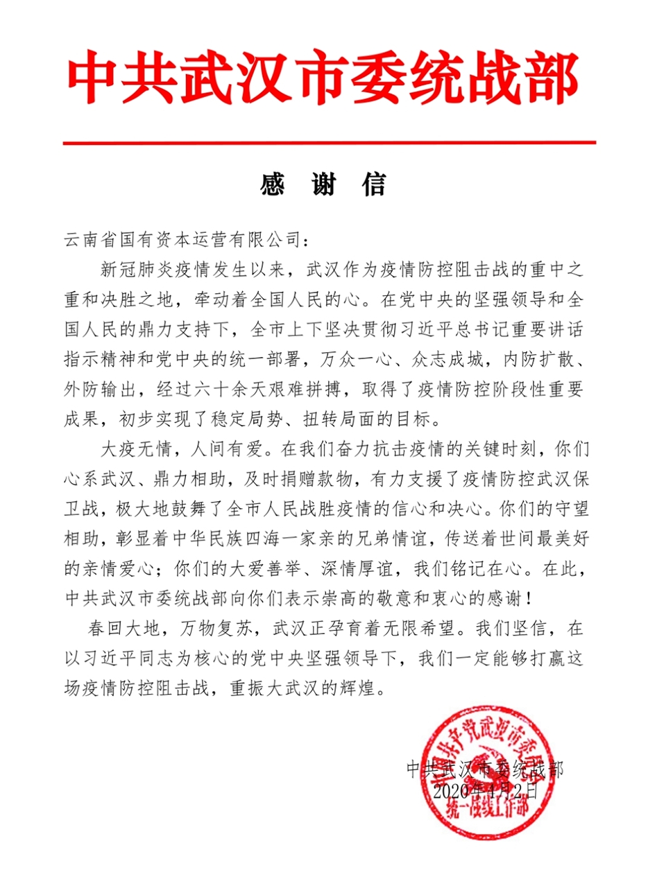 日前,公司收到中共武汉市委统战部发来的《感谢信》。感谢公司心系武汉、鼎力相助,有力支援了武汉疫情防控保卫战,极大鼓舞了武汉人民战胜疫情的信心和决心。为此,对公司致以崇高的敬意和衷心的感谢!