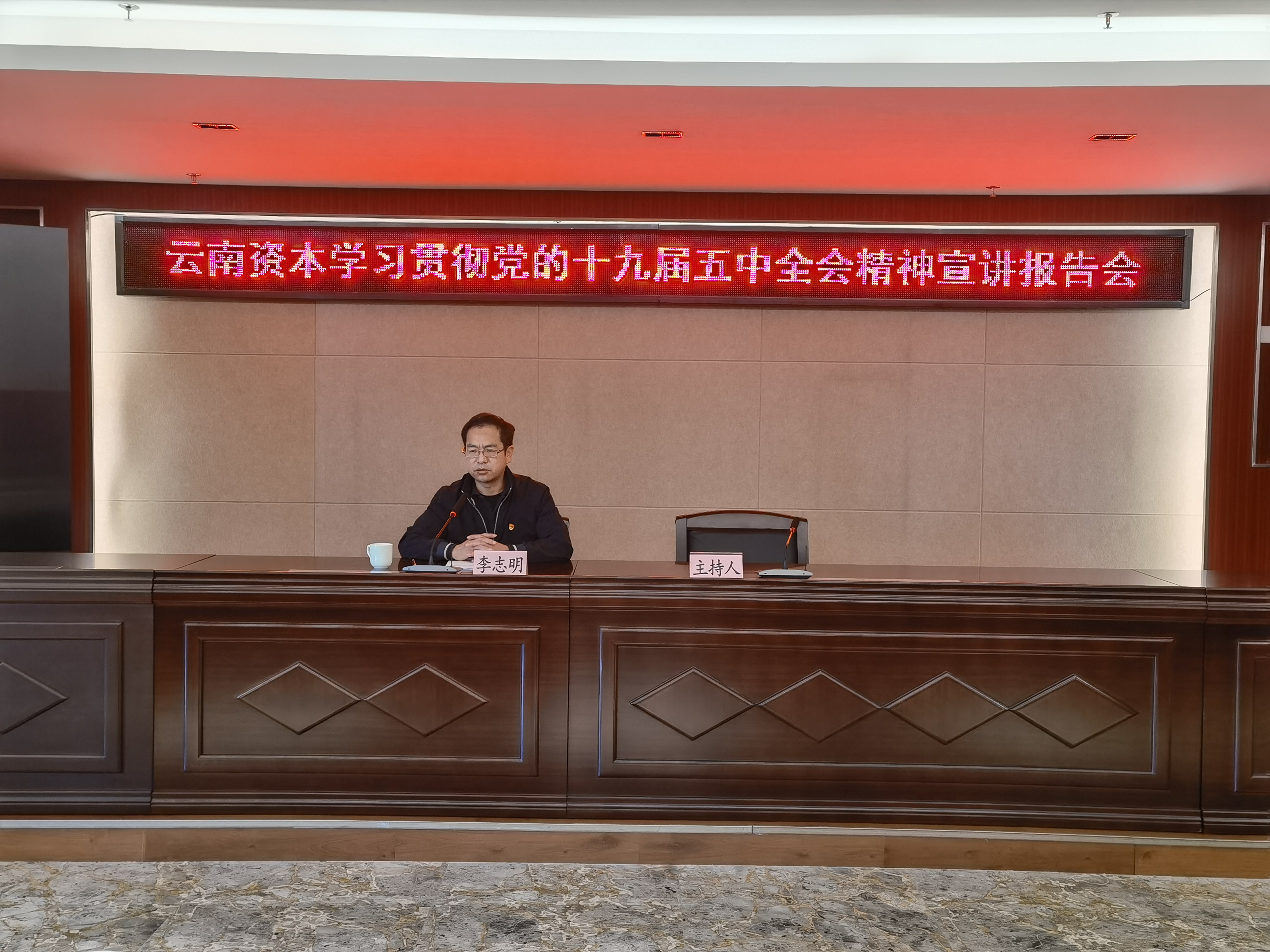 11月24日下午,云南资本公司举行学习贯彻党的十九届五中全会精神宣讲报告会。党委书记、董事长、公司学习宣传贯彻党的十九届五中全会精神宣讲团团长李志明同志作宣讲报告,党委副书记、工会主席王刚同志主持报告会。